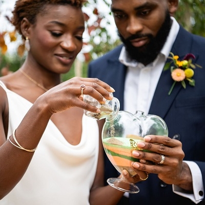 | A | Kate Mitchell says: Imagine a summer's day. You are standing with your beloved in front of your family and friends. The day is perfect and you want to capture it forever, but how? A sand ceremony, of course! You can choose a vessel that matches your tastes and before the big day, work with your chosen celebrant, choosing sand colours and discussing what each one will symbolise. This can be so much fun! You can choose the colours yourself or include the friends and family you wish to involve. Sand colours are up to you and why you choose them is completely personal. For example, maybe the colours are favourites of yours. Maybe you can let your family members choose colours that represent them, or perhaps you just want to involve colours that symbolise the love you feel for each participant. Your celebrant will put this into words for you, and on the day, each of your chosen participants will add their colours to your vessel, creating a permanent reminder of your wedding day and the love and friendship that surrounded you, captured in a beautiful keepsake. |