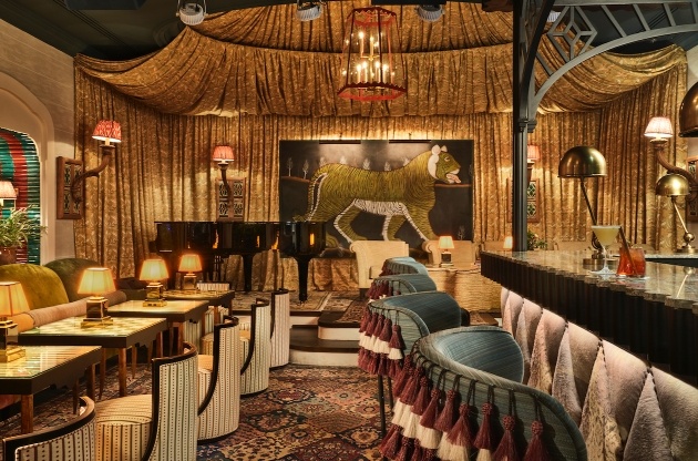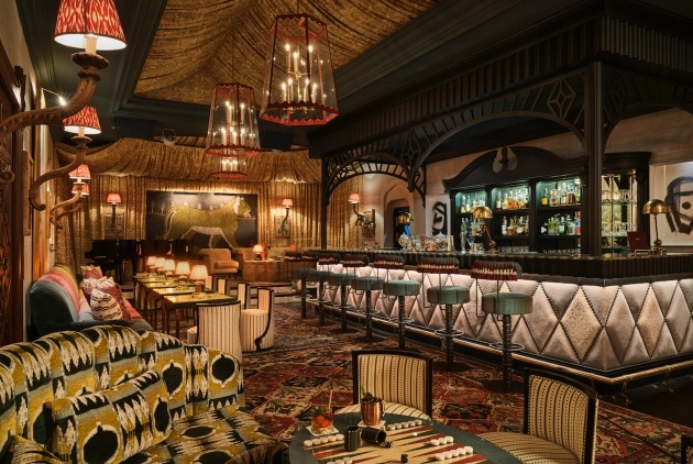 The exquisite decor features botanically inspired designs in gentle shades of russet, indigo, saffron and sage to subtly bring the freshness of the gardens inside. Encompassing two sophisticated spaces, the bar area and conservatory- style salon feature a handpainted fireplace made by artisans from Seville with merman sculptures, mythical creatures and allusions to the pine forest of the original finca on which the Marbella Club stands. Additional visual storytelling comes courtesy of raffia upholstered walls, plants inspired by Alfonso's travels, a "Plaza de España" - style circular bar, images from the hotel's colourful past and a vintage California-dreaming aesthetic that reflects Alfonso's fondness for LA's Fifties motels.