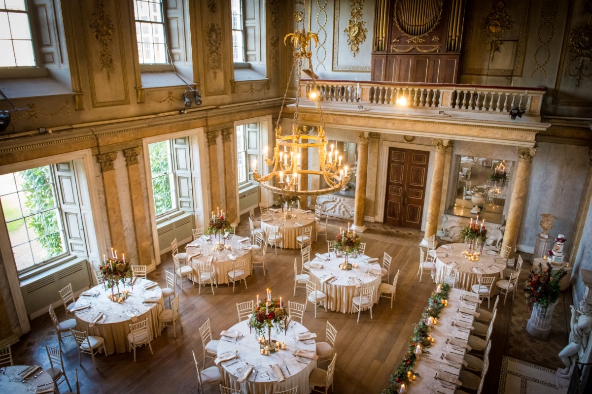 • The Gilt Hall is the hall's former music room and boasts a fabulous gilded ceiling, marble fireplace, floor-to-ceiling windows, central chandelier and original wooden floors (140 ceremony, 120 dining, 220 evening guests).
