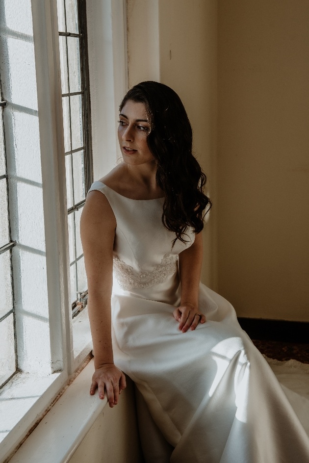 We love the soft make-up look paired with soft and elegant Hollywood waves, complete with sparkling hair accessory. Plus, the classic and timeless boat neck gown with dramatic train, finished with an ultra-modern plunging back defnitely brings the wow-factor.