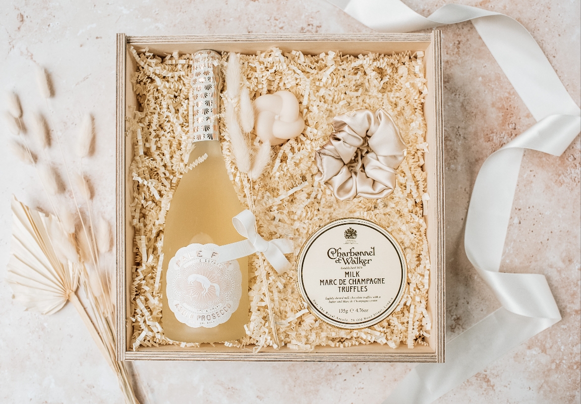 Starting from £45.00, small gift boxes* feature a mixture of high-quality items, including 375ml Whispering Angel rosé, Marc de Champagne truffles, beautiful sculpture candles, divine soaps and more. Large gift boxes**, ranging from £75-£80, feature an assortment of 750ml Pale Fox Prosecco, 750ml Whispering Angel rosé, gold edge coupe drinking glasses, bath soaks, body oils, and silk scrunchies.