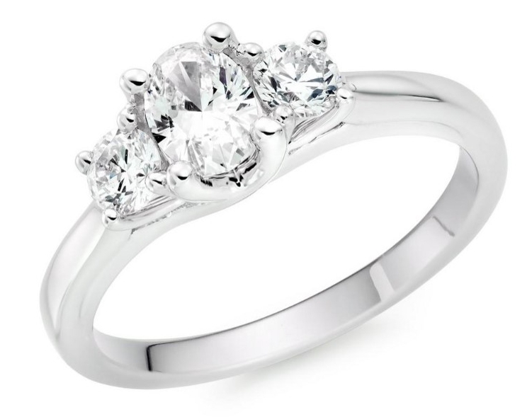 "For anyone looking for the ultimate statement piece, this spectacular Platinum Diamond Three Stone Halo Ring (£5,750) features three oval-shaped diamonds, set against a sparkling myriad of round, brilliant diamonds. You could also opt for this Platinum Three Stone Diamond Ring (£3,500) for a similar, yet classic look."