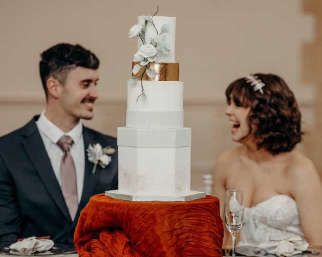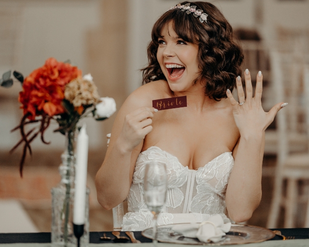 "For the table we decided against the standard white cloth and tried to challenge the stigma around using black at weddings. We added a sage green table runner to add depth to the table and styled with a simple floral table centerpiece and elegant black candlesticks. We added gold features throughout the shoot to add a touch of class."