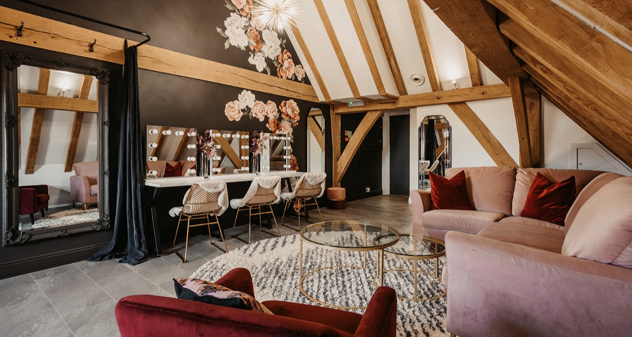 The Old Kent Barn's dressing room has had a makeover! Designed thoughtfully to maximise the space, light and photo opportunities, the look centres around the pink sofa, a feature synonymous with the barn's main dressing room.