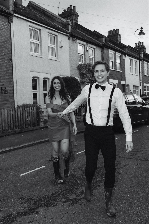 "Our Christmas proposal shoot shares all the love, laughter and passion of a December engagement. We chose a London home for our location and styled its living room with bows, foliage and modern art. We mixed traditional seasonal elements with contemporary, opulent touches like Isabelle's red mini dress and platform shoes, and Ross' black velvet braces.