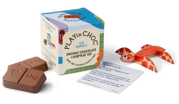 These eco-friendly, vegan, and allergen-free treats come in 100% recyclable packaging. Each box contains two creamy chocolate bars wrapped in compostable packaging, along with a 3D card puzzle toy featuring animals like endangered species, sea creatures, or dinosaurs - there's also a fun animal fact inside.