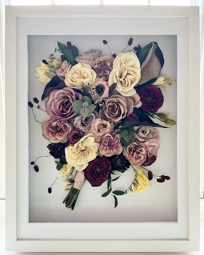 Placing your preserved flowers in shadow boxes is a great way to show them off. These are deep frames with a glass front to protect their contents. Simply select a shadow box that matches your interior style and is deep enough to accommodate the size of your bouquet. Then, arrange the dried flowers inside. You can also add other mementos from your wedding, such as invitations and photos.