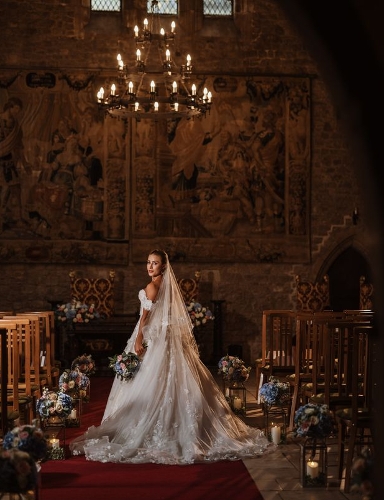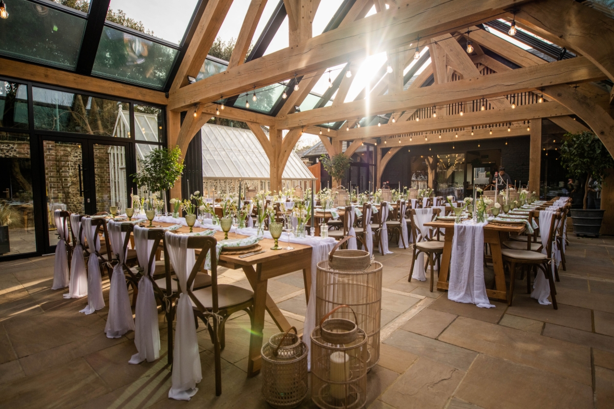 Seamlessly blending indoor and outdoor living, this light-flooded space features floor-to-ceiling glass windows, bi-fold doors and a retractable glass roof – all with a striking original oak frame at the centre. Boasting views on to the surrounding walled garden and bordered by the estate's flourishing wild apple orchard, the intimate and relaxed ambience of The Glass Courtyard is ideal for couples looking for smaller, personal gatherings in a serene, natural setting.